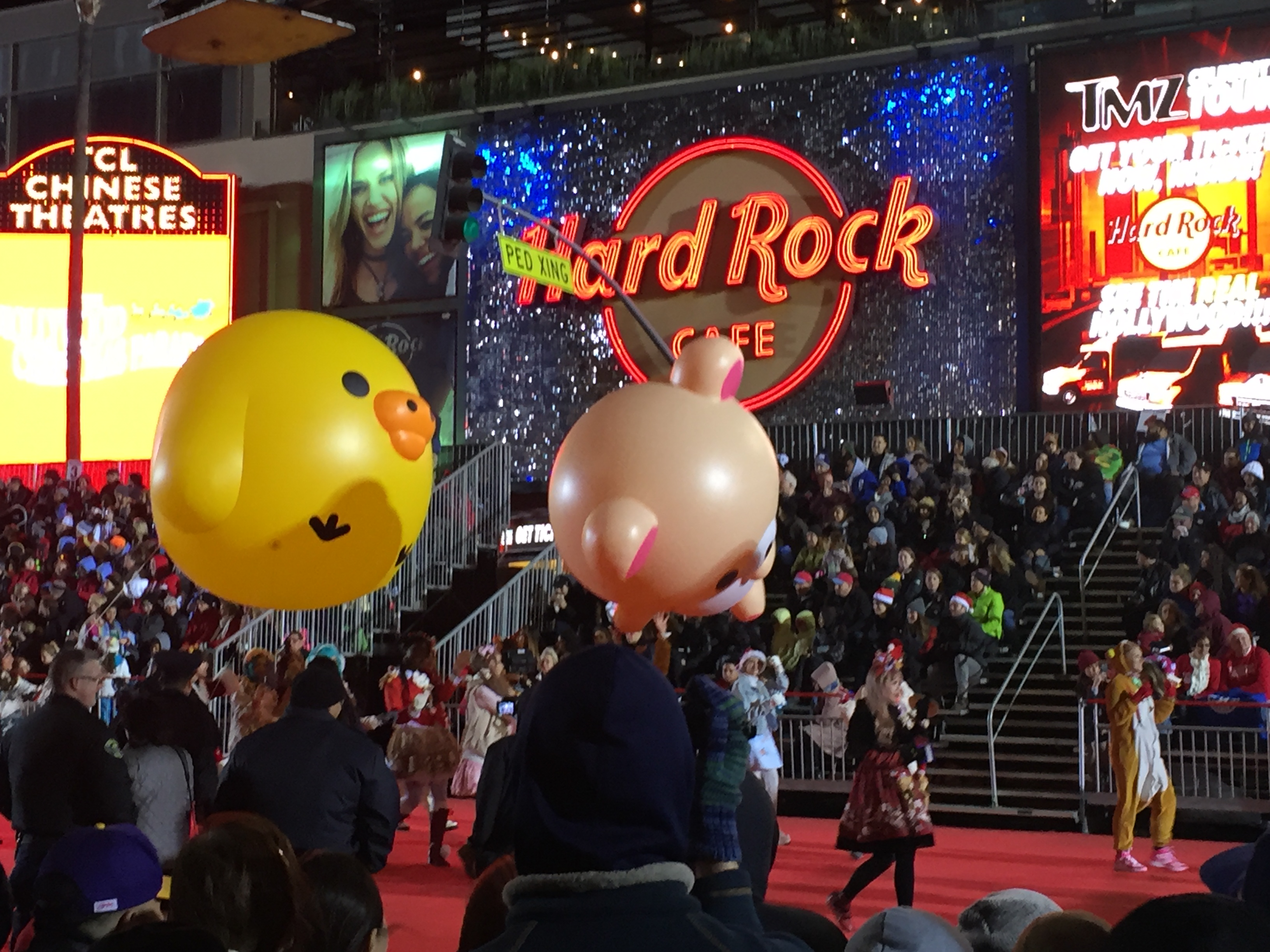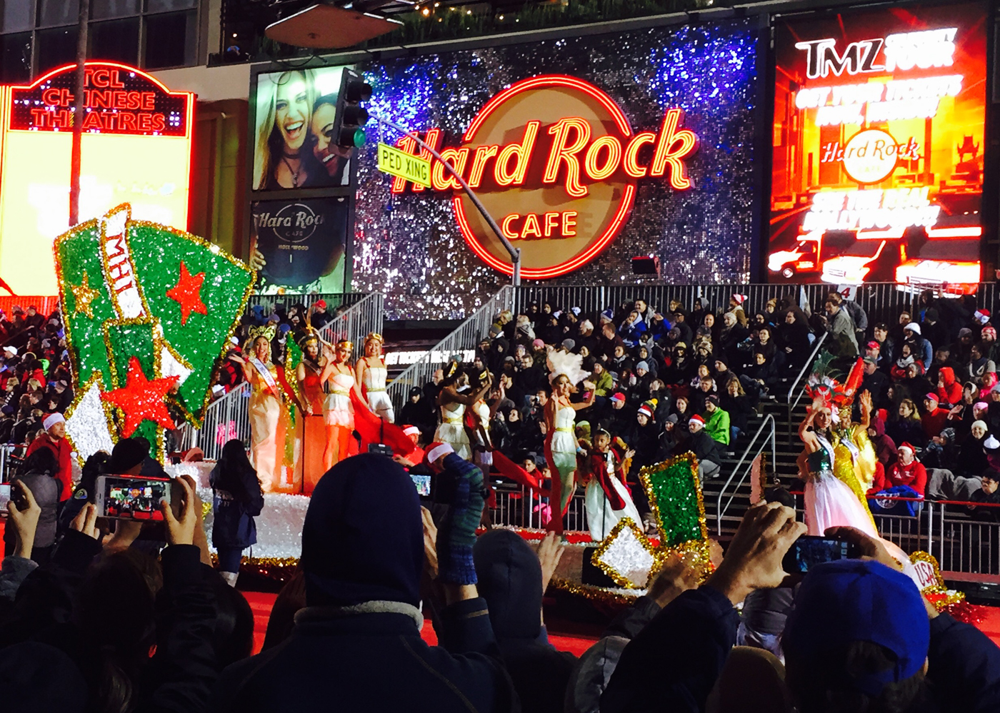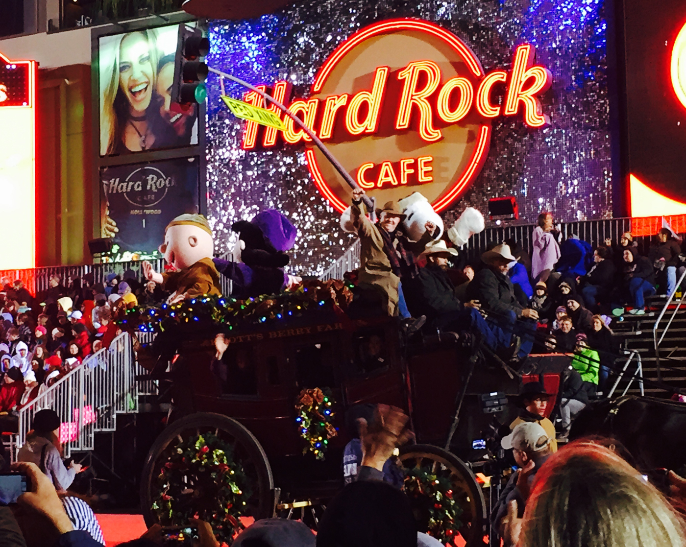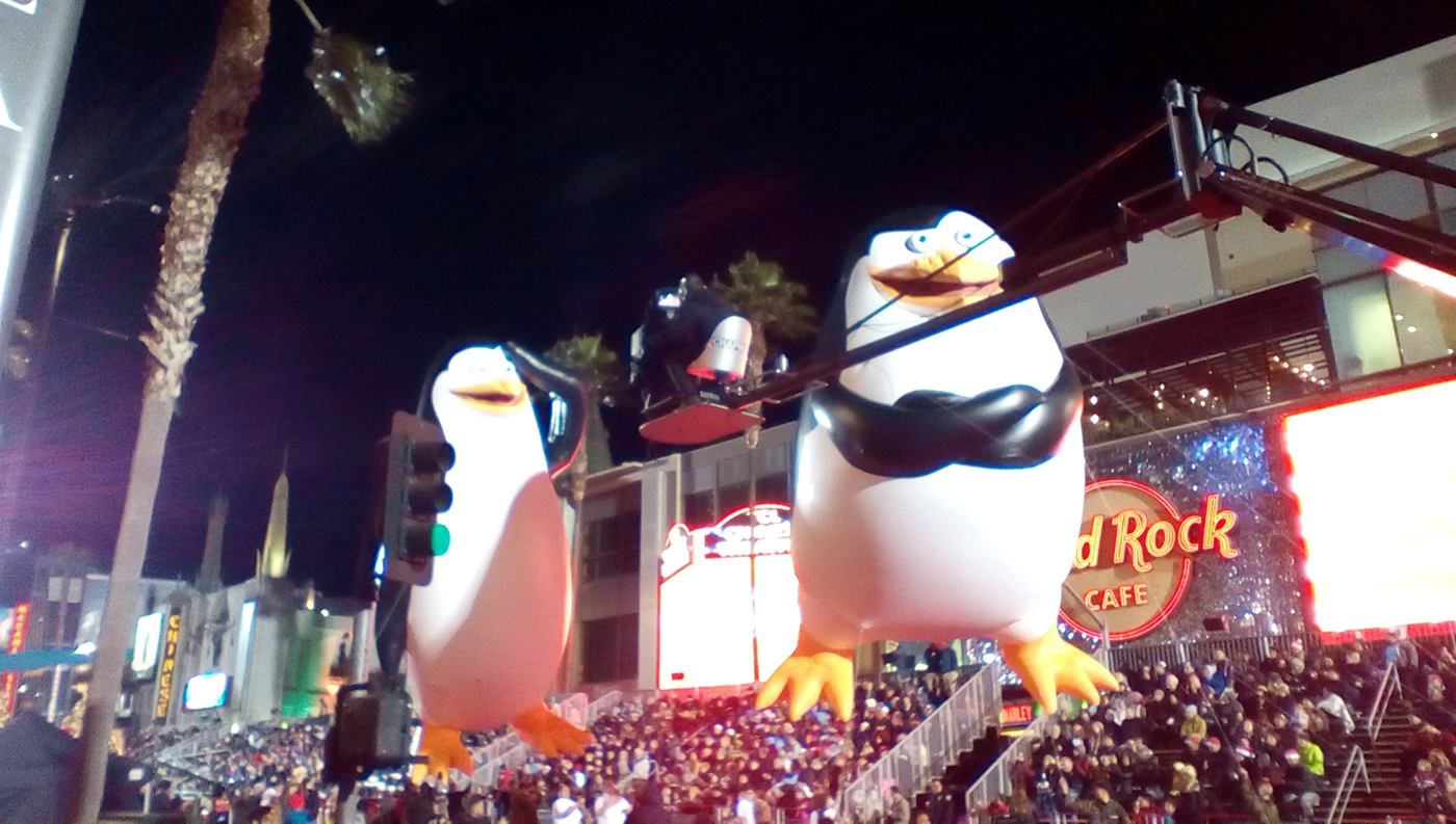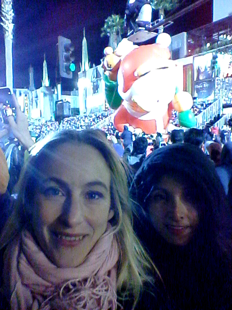 För första gången sedan jag flyttade till LA såg jag i år den stora julparaden i Hollywood. Det var ganska kyligt, men som tur var regnade det inte i alla fall vilket det har gjort andra år. Starten är vid Chinese Theater på Hollywood Blvd och går sedan bort till Vine och ner till Sunset Blvd för att sedan komma tillbaka till starten. Folk hade börjat köa längs paradvägen redan under tidiga eftermiddagen för att få de bästa platserna. Jag och Maria kom lagom till att det skulle börja och fick ganska bra platser mittemot läktarna i början av paradvägen. Först ut var bilarna och sedan varvades parader med seriefigurer och kändisar. Nästan två timmar tog det innan alla hade passerat oss.